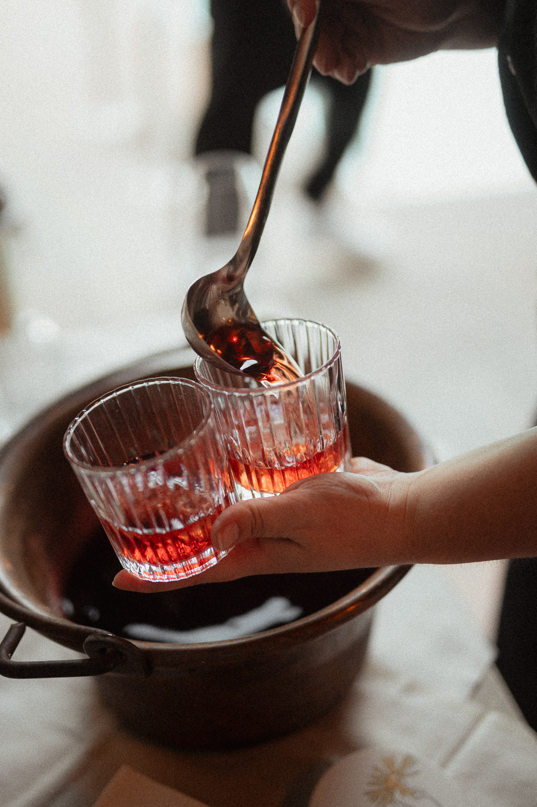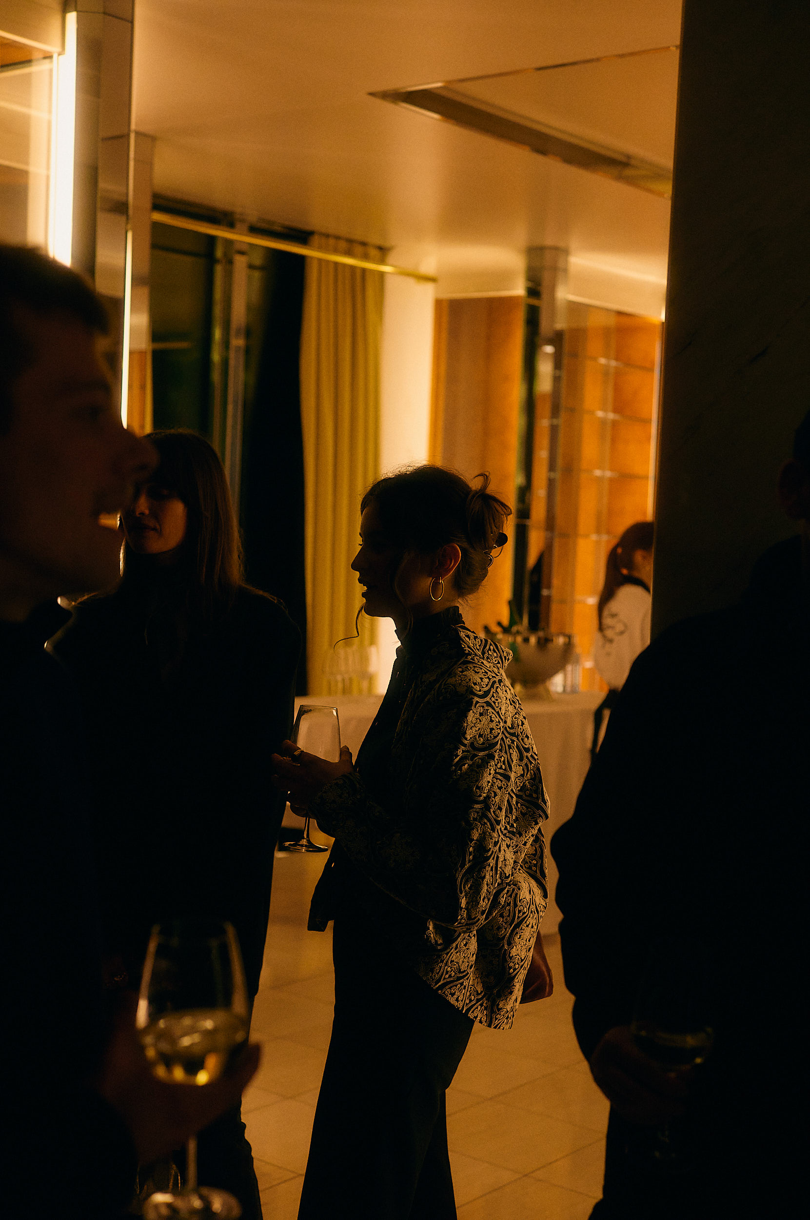 The night began in the library, where guests enjoyed an aperitif, setting the tone for the evening. The fireplace burned, adding warmth as conversations started to flow.