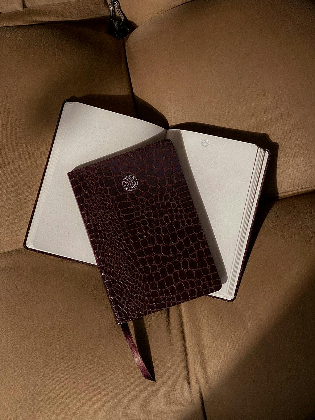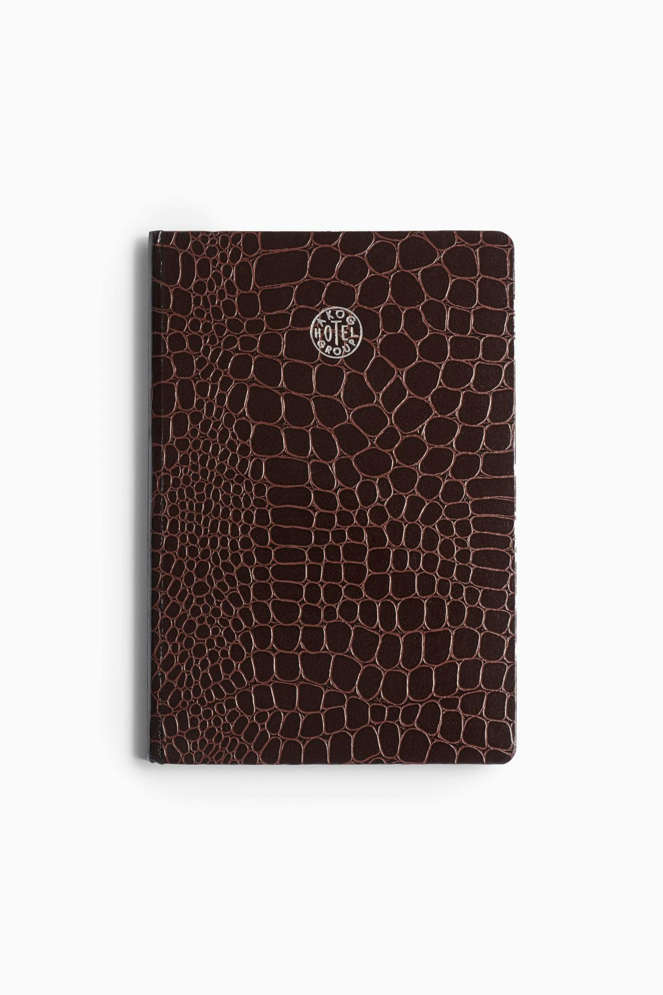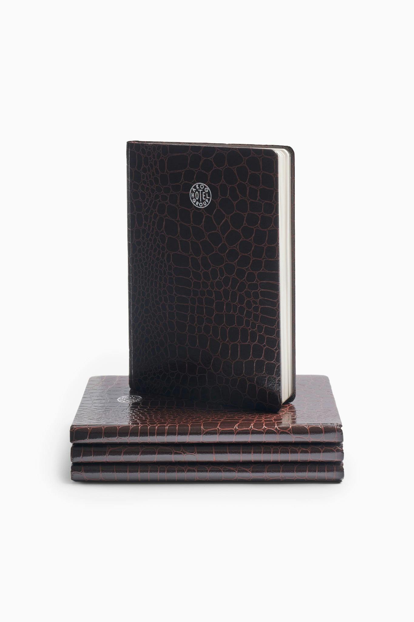 Bound in a crocodile-style cover in deep chocolate brown with the AKOG Hotel Group logo on the front, it holds 160 pages of recycled 90g paper, perfect for notes, sketches, and memories. Details like a ribbon bookmark and an interior back pocket make it as functional as it is refined.