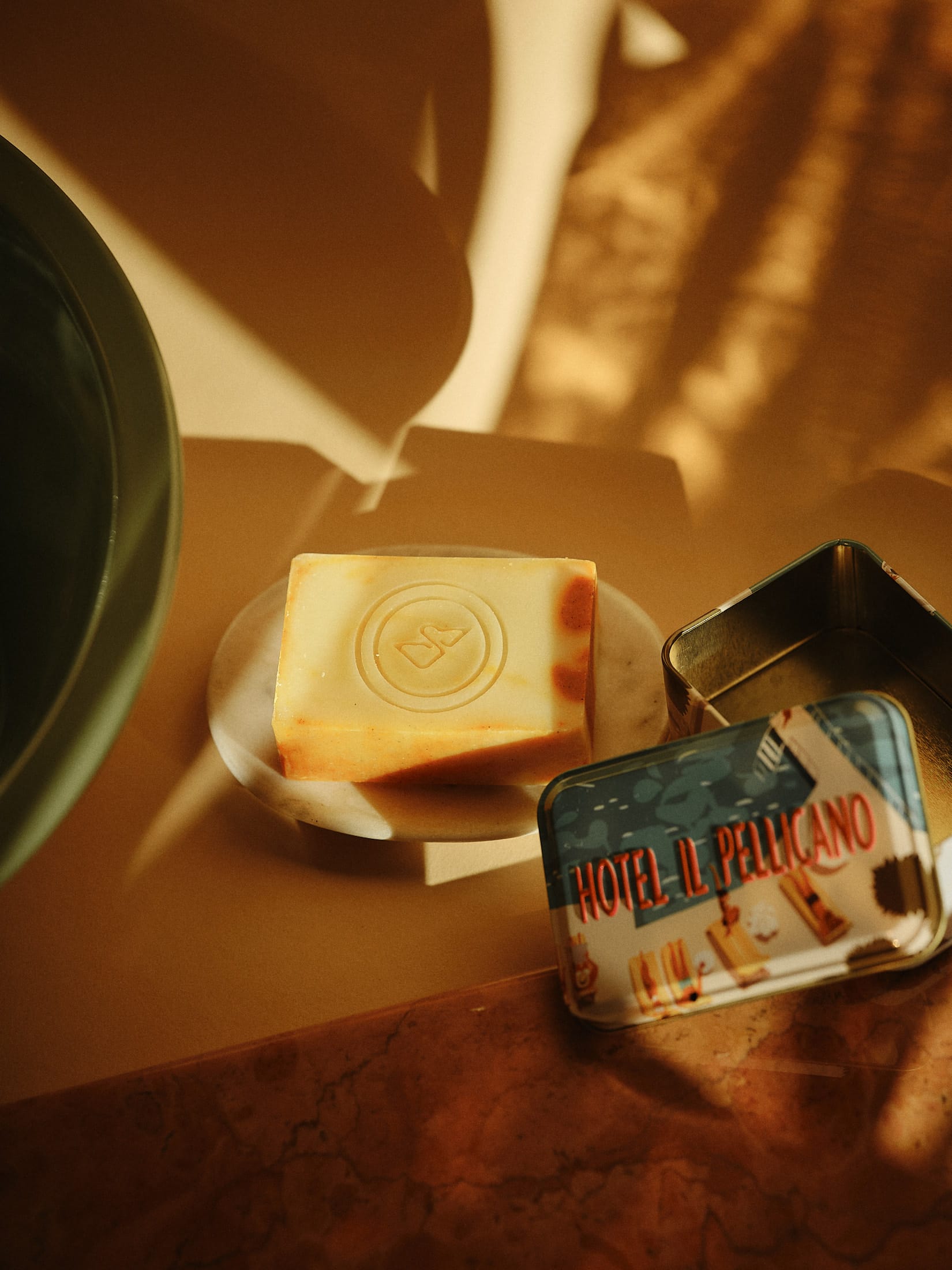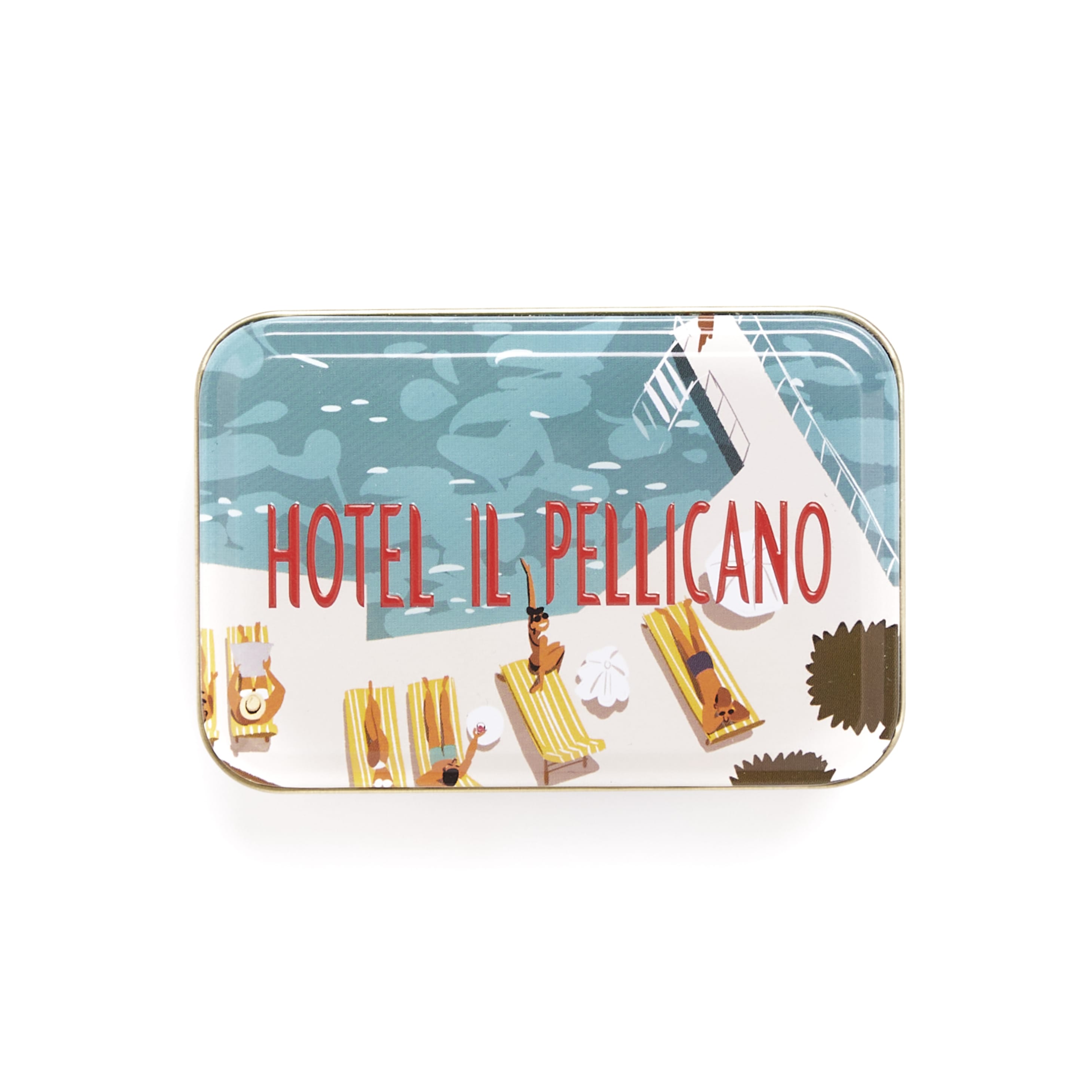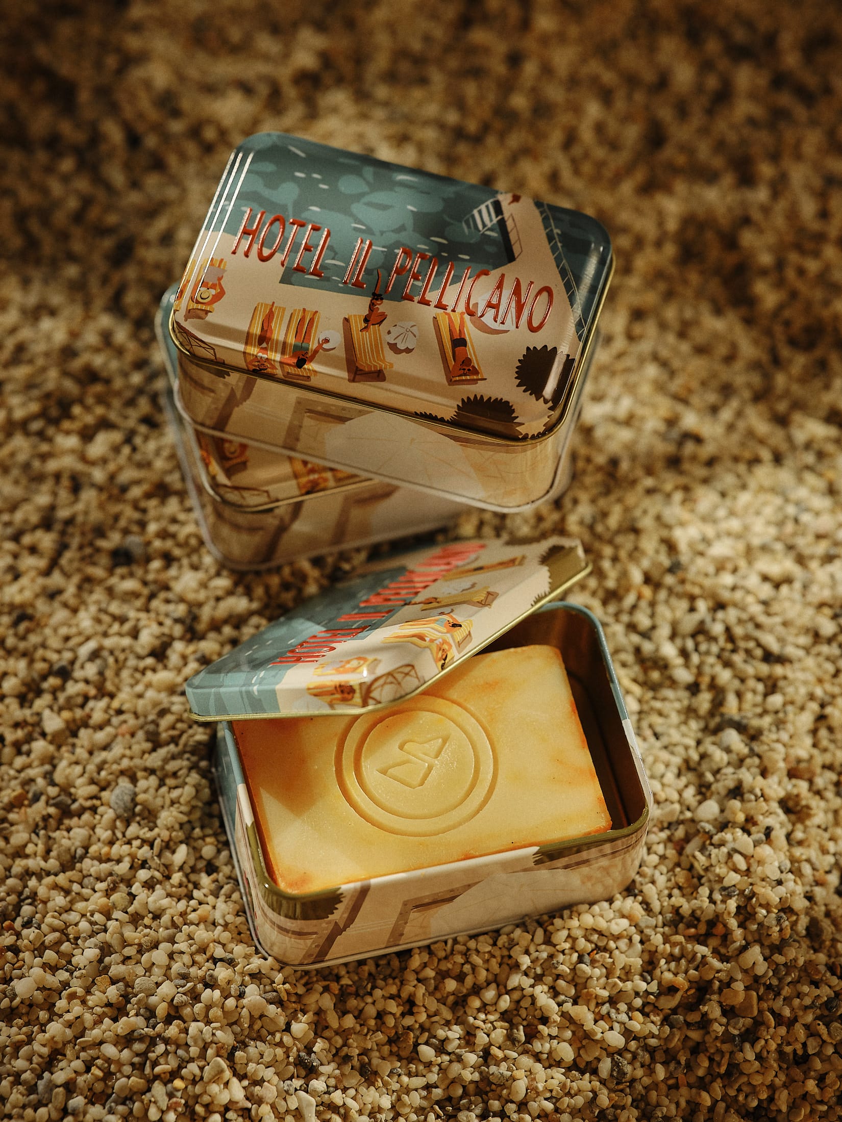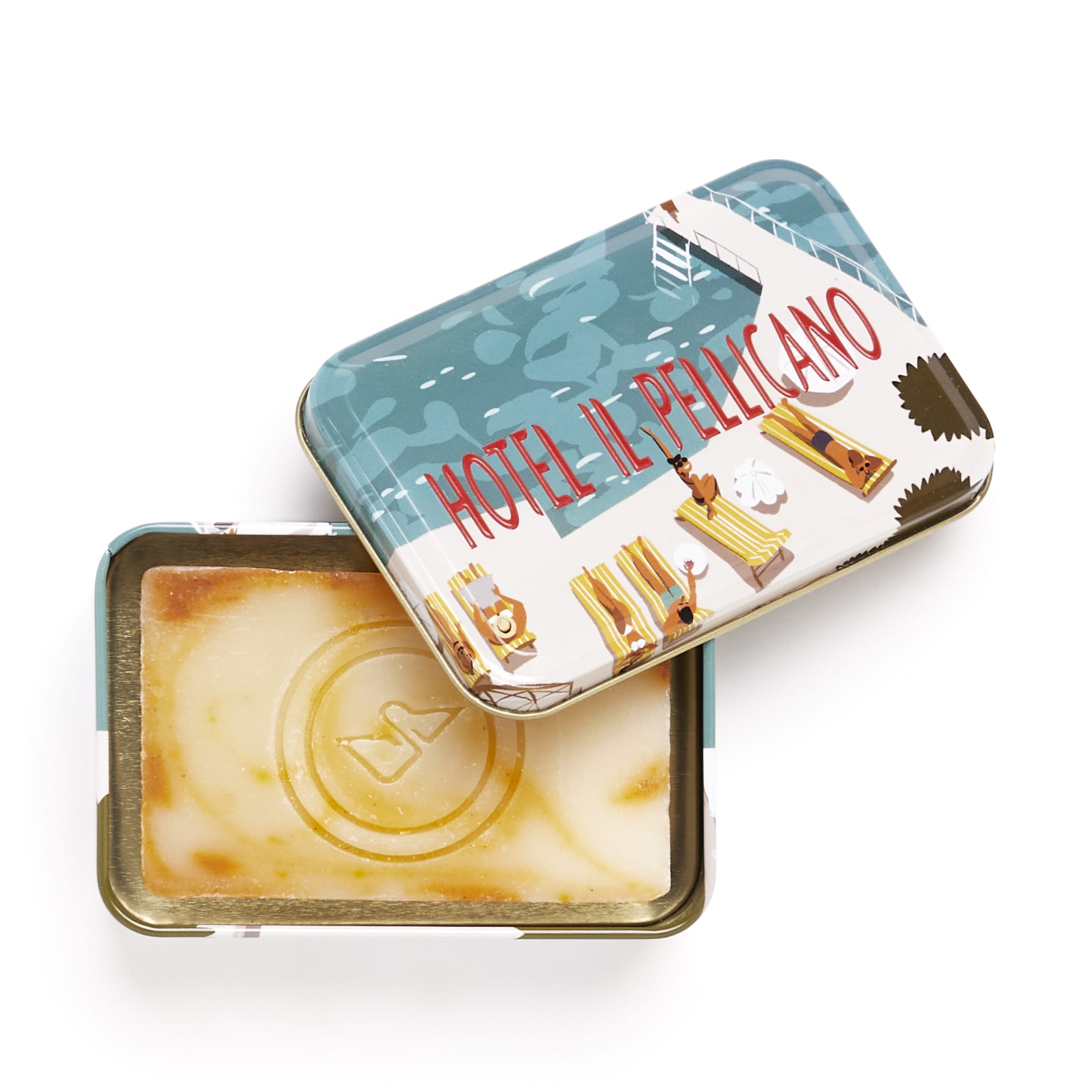 Take a bit of it home in your suitcase with this rosemary and sage hand soap. Pressed with a yellow and orange marbling and a debossed Pellicano pelican on the top, this nice little souvenir soap will bring you back pool-side each and every bath-time. In between scrubs, keep your bar out of harm’s way in the beautifully illustrated tin travel box.